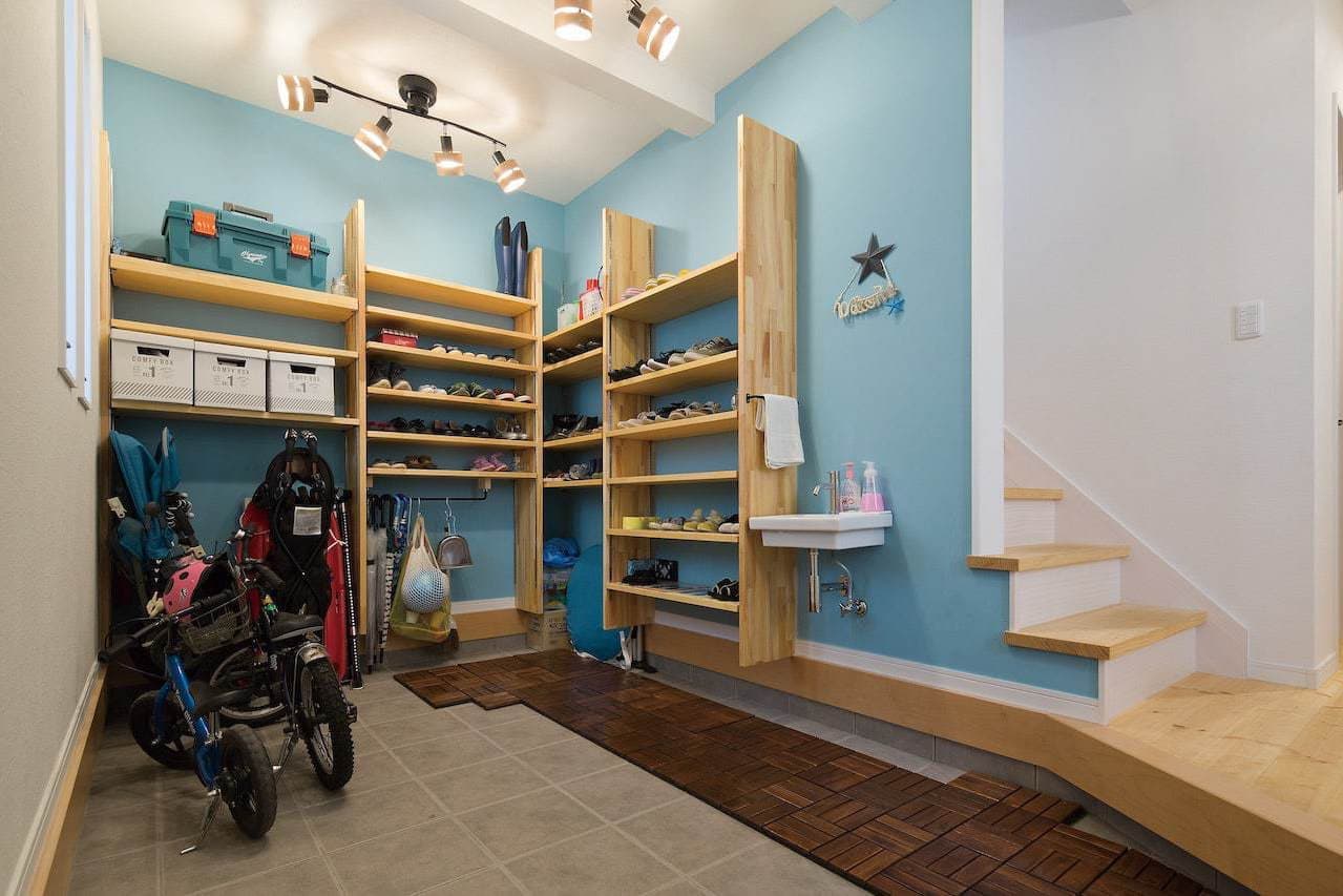 子育てに重宝する広い土間玄関は、趣味の多いご家族にもぴったり!お気に入りのカラーの塗り壁でカラーコーディネートされた空間は、疲れて帰ってきた時でも気分を明るくしてくれますね!