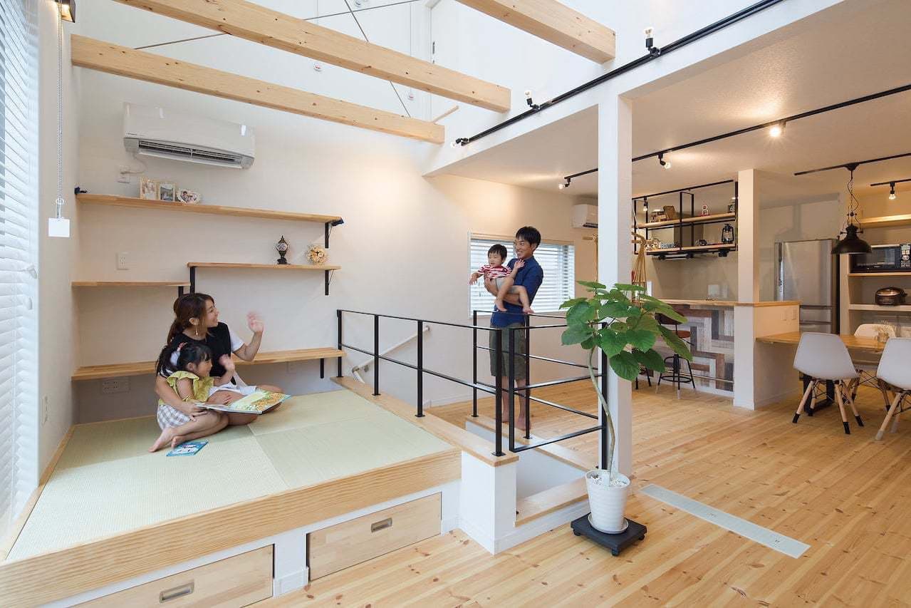 こだわりが詰まったリビングダイニングは、大きな吹き抜けに対面キッチン、無垢床と、オシャレな注文住宅では定番のプランニング。さらに、小上がりの畳スペースは、子供の遊び場にも、お昼寝空間にもなって非常に便利です!