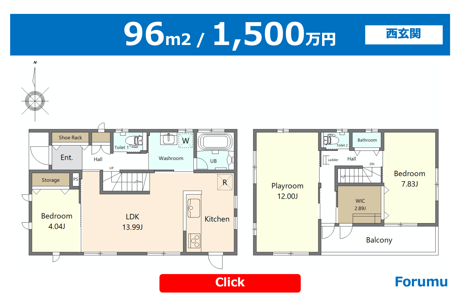 HOME | 間取り集 | madori-18 |Room Plan 18 間取り 18 2階建 / 一般住宅 / 25-30坪 / 西玄関 / 1階リビング 96m2 / 3LDK 1,500万円 リビングイン階段 / 子供部屋を将来2部屋に変更可能 / 対面キッチン / 全室エアコン 前の間取り 次の間取り 間取りTOP イベント